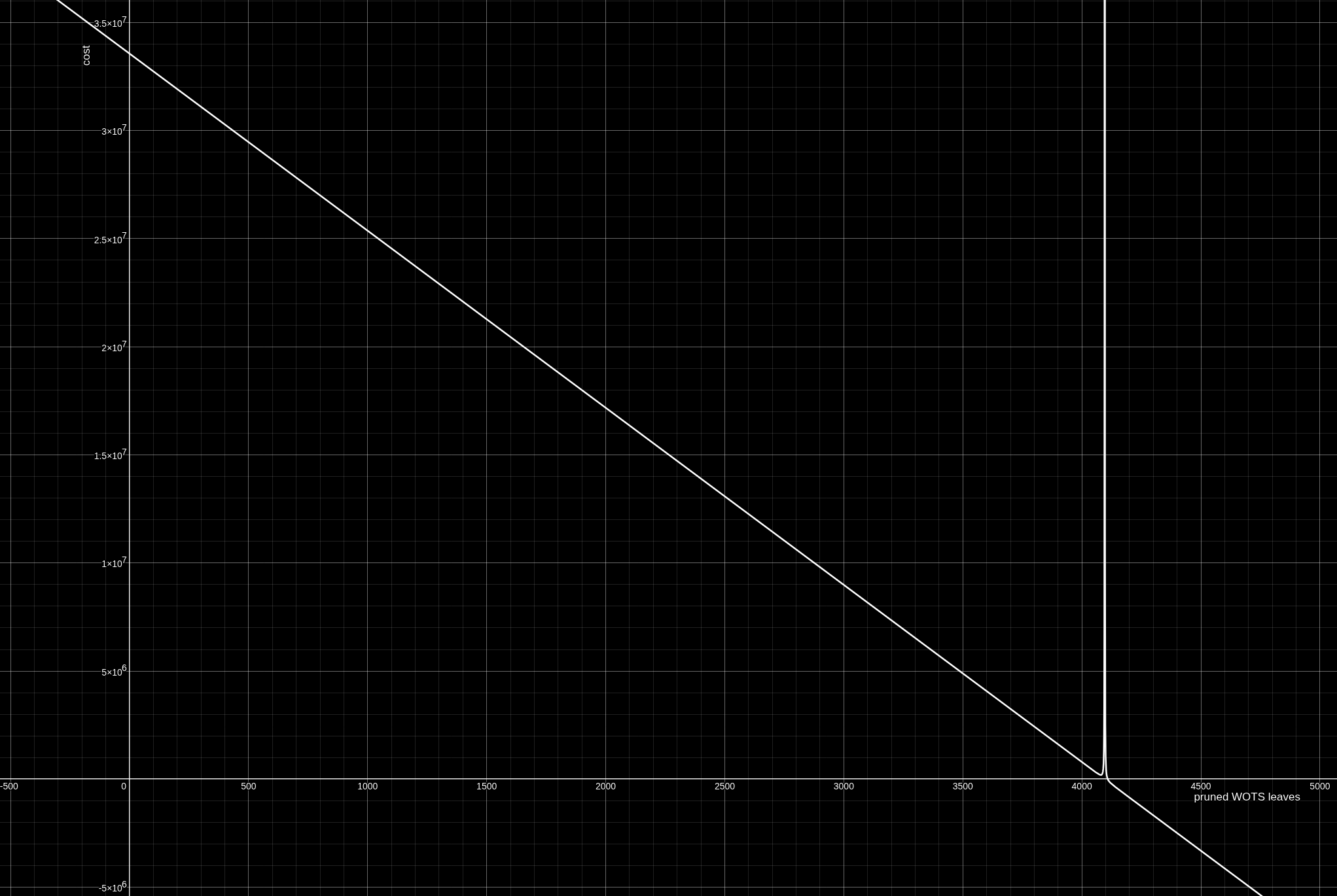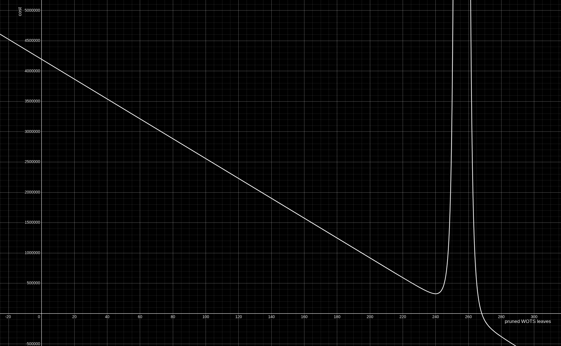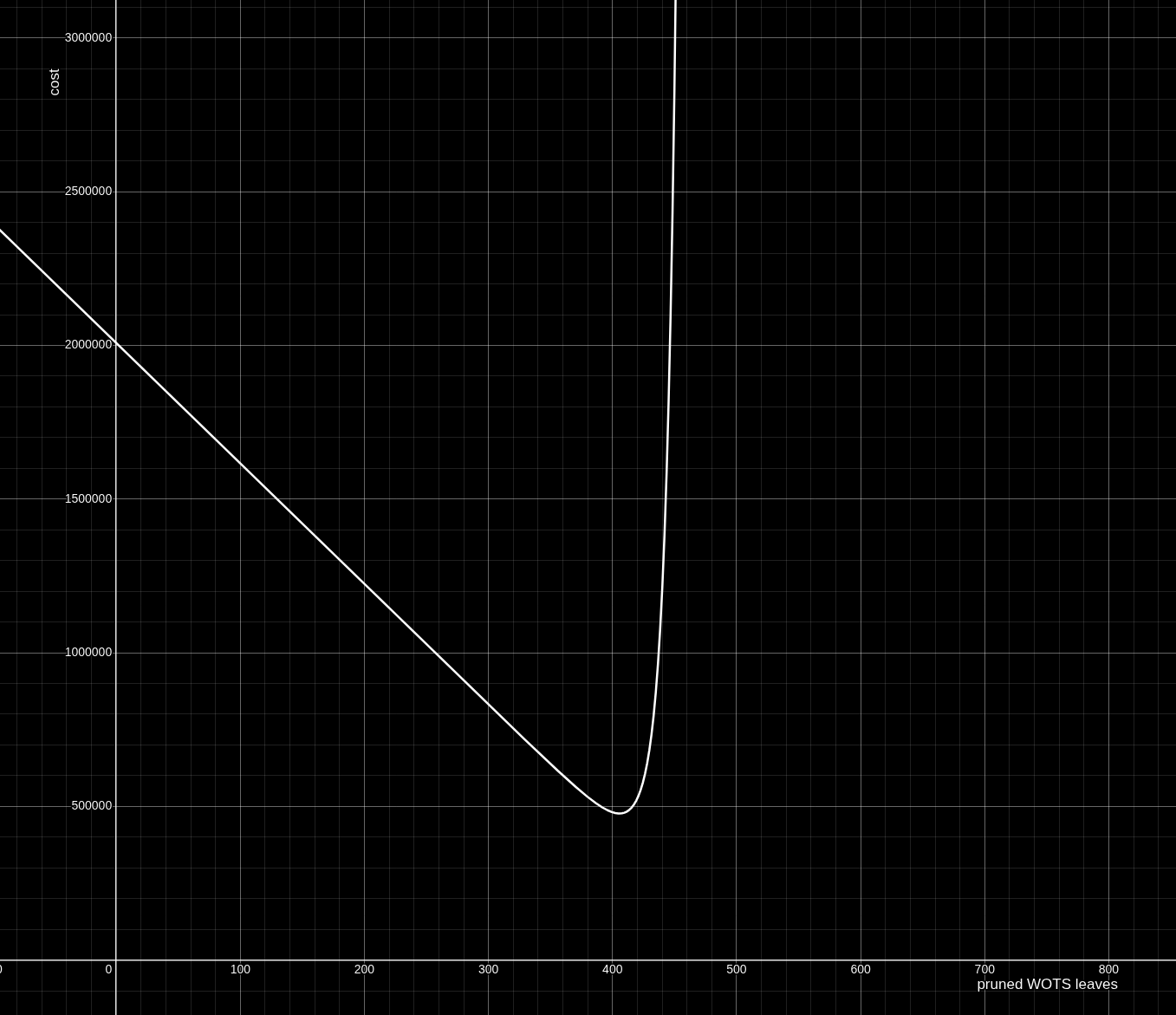 Fascinating! The net cost function appears to decay almost linearly, until we’ve pruned around 400 of the 512 WOTS leaves per XMSS tree, at which point the grinding cost term starts to explode exponentially as